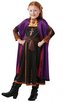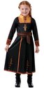 Dětský karnevalový kostým Ledové království 2 - digitálně potištěné šaty s folklórními detaily a falešnou blůzou s našitou broží u výstřihu, dlouhé přiléhavé rukávy s tištěným lemováním copánky a odnímatelný pásek se zavazováním na bocích, sukně je potištěná a třpytivá s kovově lesklým lemováím. Součástí je i luxusní odnímatelný dvoubarevný plášť z veluru, 3D knoflíky. Boty nejsou součástí kostýmu. Velikost 116.