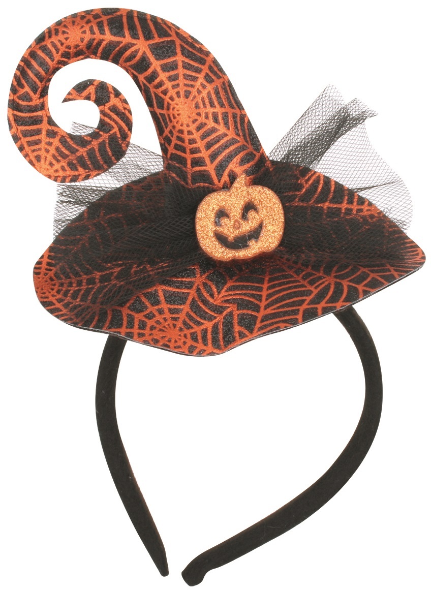 - Oranžová čelenka s motivem čarodějnického klobouku a dýně.
