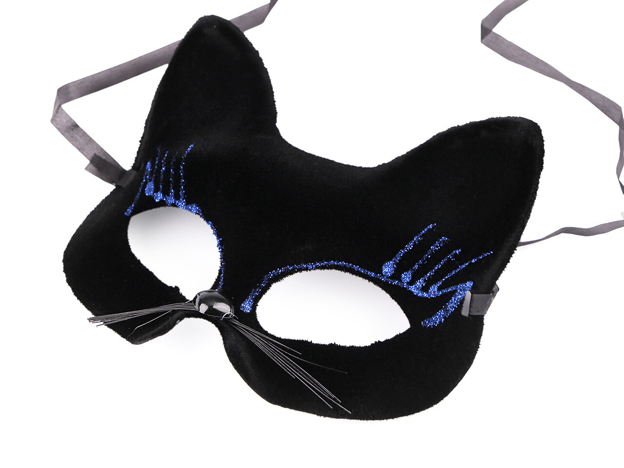 Karnevalová maska - škraboška sametová s glitry kočka - 1 ks - 4 černá modrá