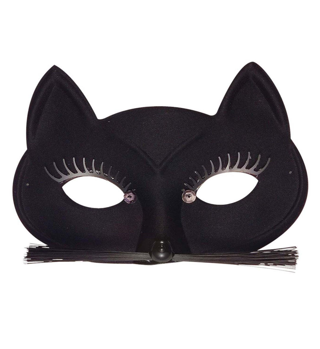 Škraboška karnevalová kočka, černá s vousky a stříbrnými řasami, látková