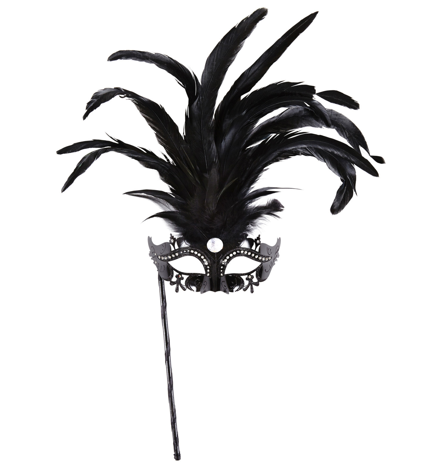 Ozdobná karnevalová škraboška s držátkem. Zdobená kamínky, štrasem, glitrem a peřím.
