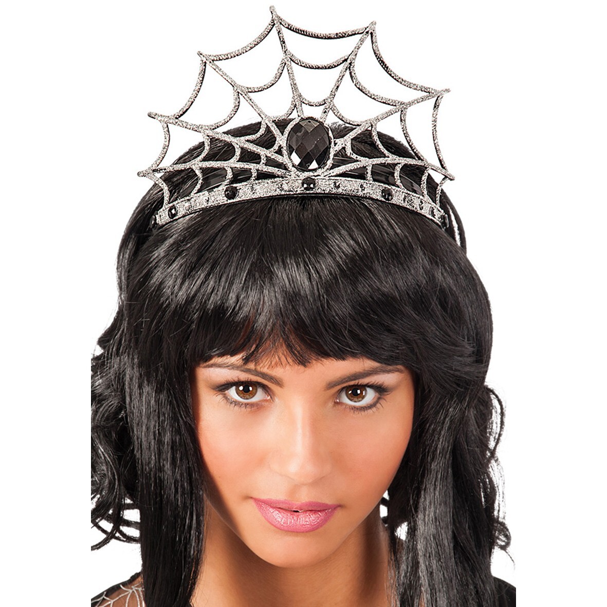 Čelenka ve tvaru pavučin zdobená černými kamínky, kterou můžete nosit jako nádhernou korunu ztělesňující temnou královnu.