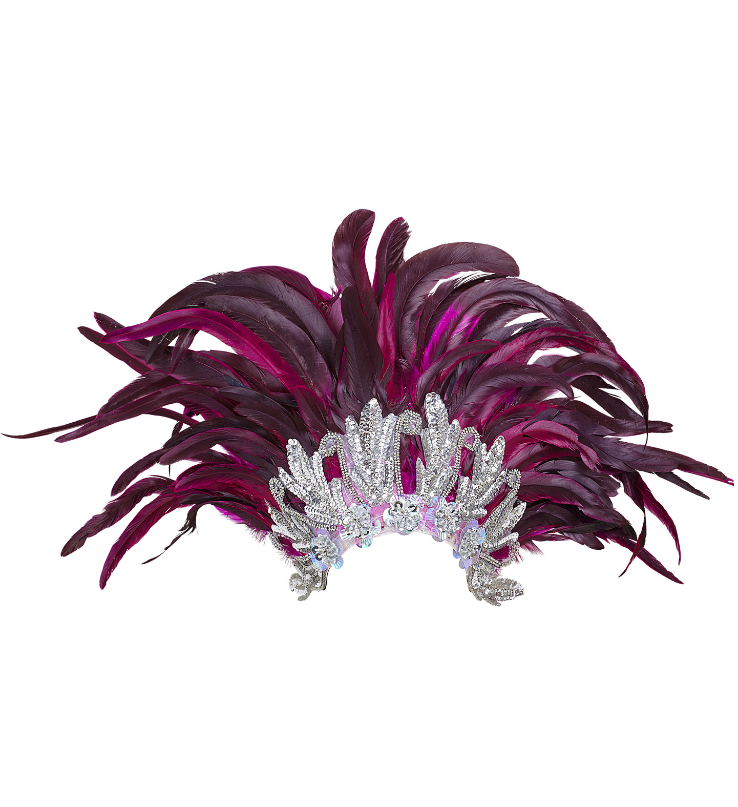 Fialová péřová čelenka se stříbrnou flitrovou dekorací, pro tanečnici ve stylu karnevalu v Riu.