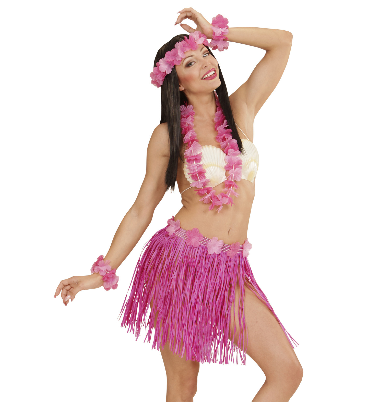 Havajský komplet, havajská sukně s květy,věnec, čelenka, 2 náramky.