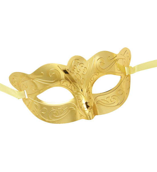 Metalická karnevalová škraboška, plastová, uvázání na stužku.