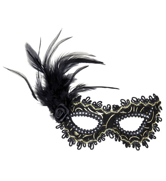 Černá karnevalová škraboška s peřím a černou růží.S krajkou, zlatým prošíváním a stříbrnou konturou okolo očí. Upevnění vzadu gumičkou.