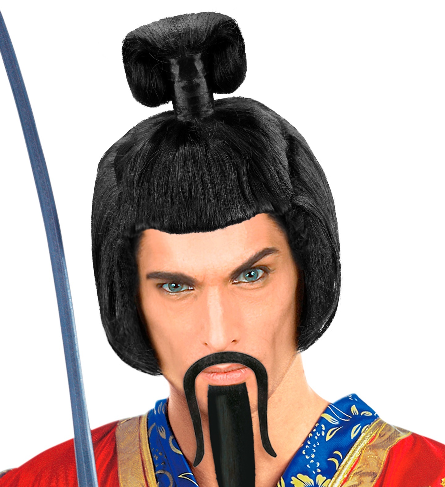 Karnevalová paruka Samuraj, černá, balená v plastové krabičce, bez vousů.