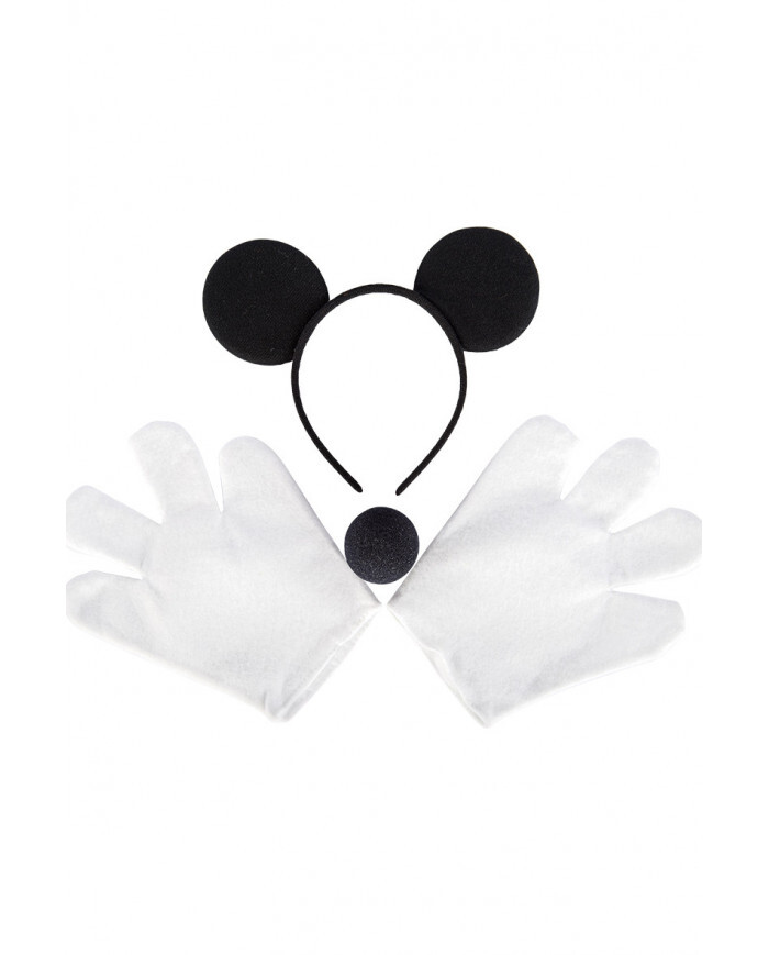 Doplňky Mickey Mouse pro děti, skládající se z čelenky s ušima, bílých rukavic a kulatého pěnového nosu. Vhodné k jednoduchému karnevalovému kostýmu i jako každodenní hra.