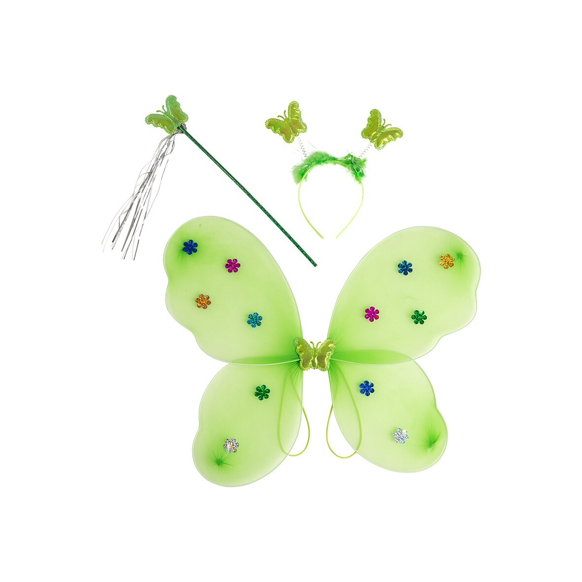 Zelená sada motýl sestávající z křídel, čelenky a hůlky. Pro okouzlující karnevalový převlek nebo pro každodenní hru.