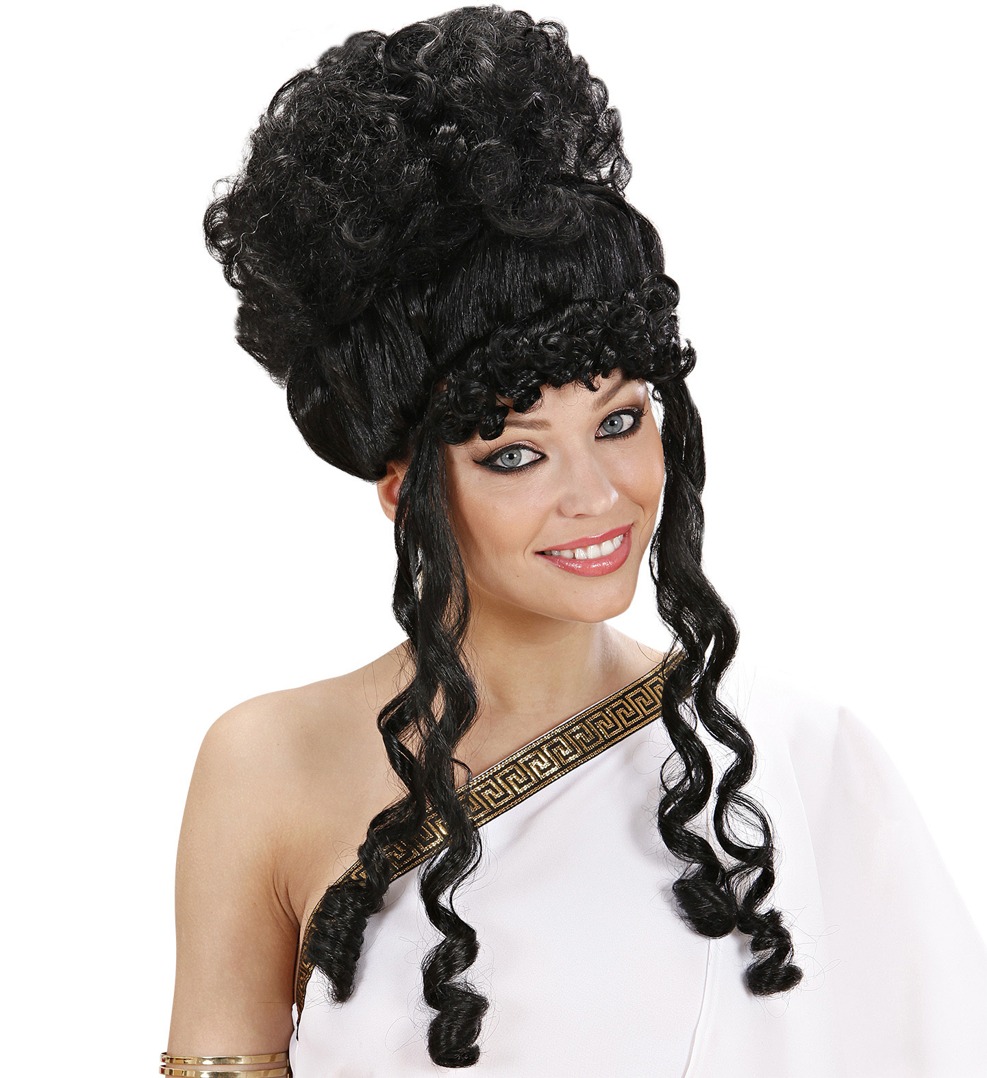 Černá dobová paruka "Olympská bohyně" v plastovém boxu.