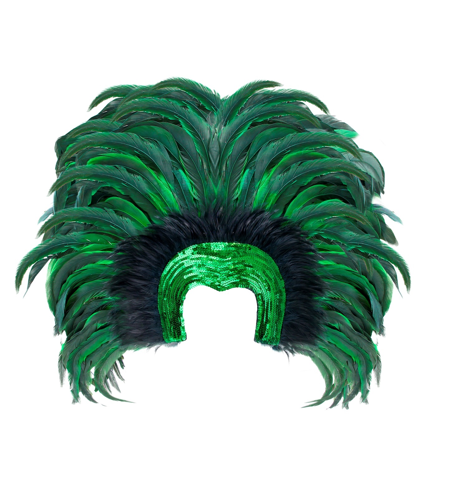 Flitrová čelenka s peřím, Rio. Uchycení gumou, velice stabilní. Barva: zelená Materiál: 80% peří, 15% PVC, 5% polyester
