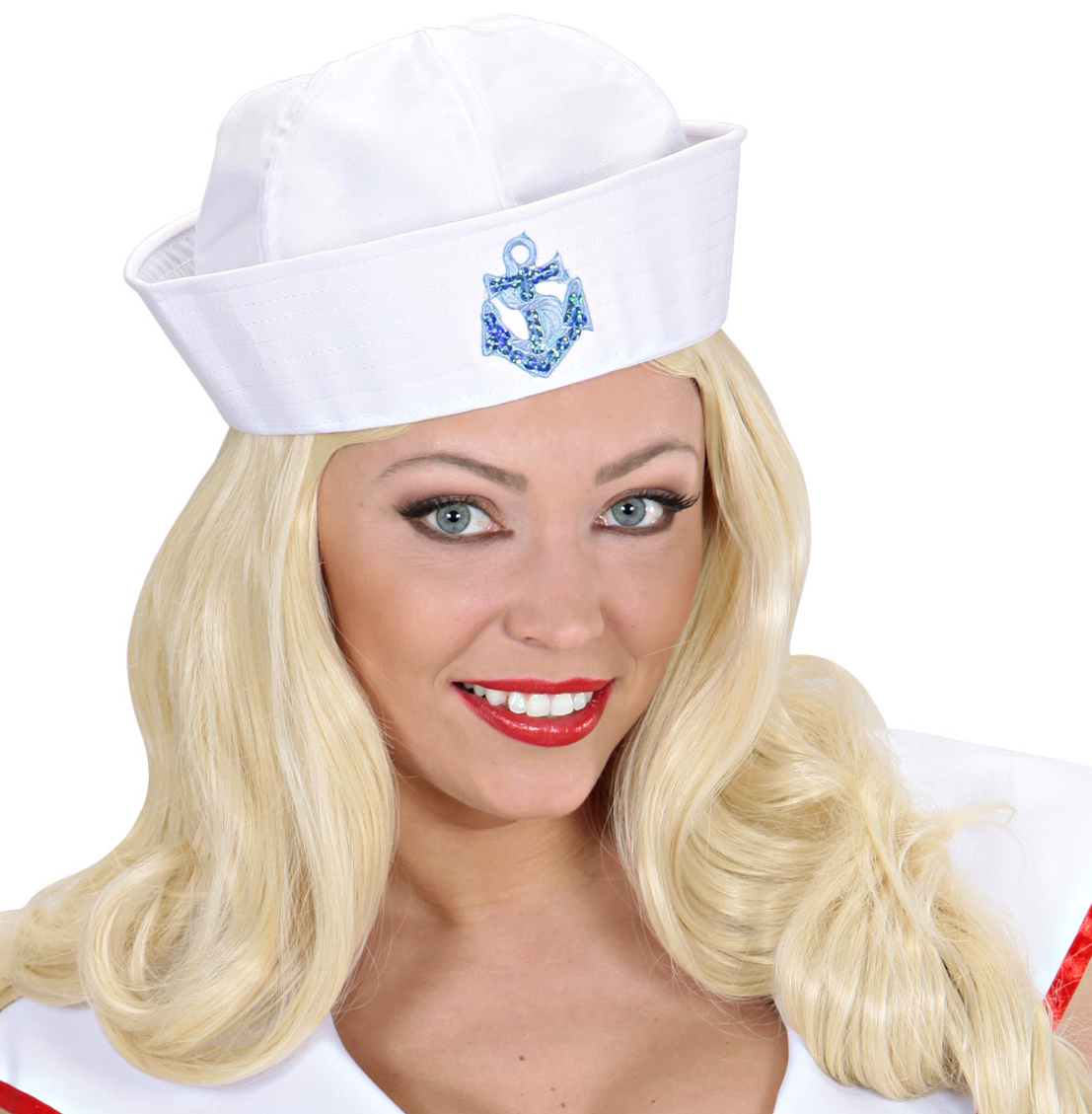Čepice námořnice s ozdobnou kotvičkou, látková. Bílá látková čepice s vyšitou modrou kotvičkou ozdobenou flitry vhodná ke kostýmu námořnice, od firmy Widmann. Materiál: 100% polyester Obvod hlavy: 56 cm Určeno pro: dámská