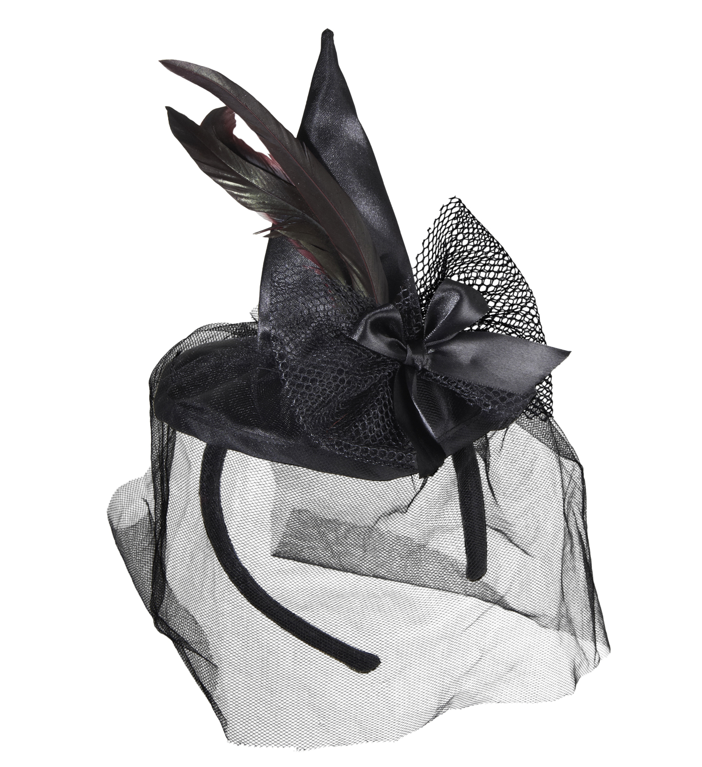 Čarodějnický miniklobouček na čelence s peřím, stužkou a závojem.