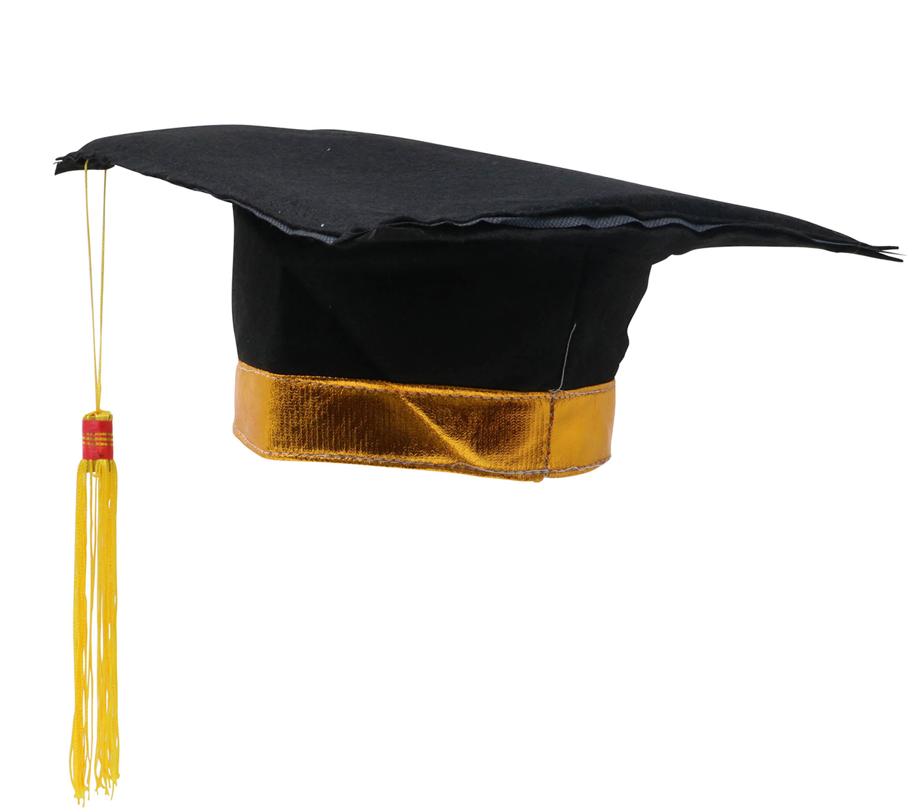 - Stylový design: Zlatá krempa a žlutý střapec podtrhnou slavnostní atmosféru.