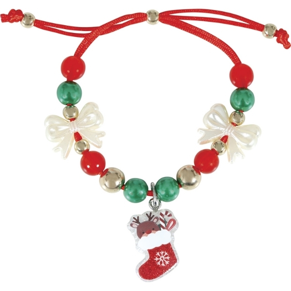 Vánoční náramek s přívěskem červené ponožky přináší hravý sváteční vzhled, který potěší děti i dospělé. Ozdobné korálky v červené, zelené, bílé a zlaté barvě doplňují jemné plastové mašličky, které náramku dodávají ještě slavnostnější dojem. Dominantním prvkem je třpytivý přívěsek vánoční ponožky, který krásně vynikne na zápěstí.