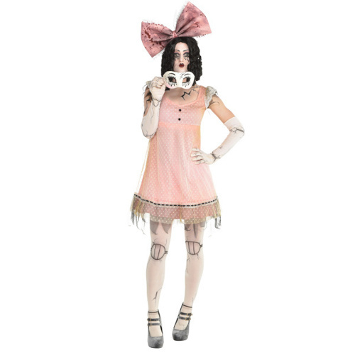 Kostým hororové panenky. Hodí se jako převlek na Halloweenskou party, karneval, nebo jen tak pro zábavu. Okouzlující. roztomilá... Tak to v tomto případě nehrozí! Převlečte se za hororovou panenku a dostaňte své blízké svým krásným ale přesto naprosto děsivým vzhledem. Kostým obsahuje dlouhé šaty, čelenka s velkou mašlí, punčochy a rukavice a maska na obličej. Boty nejsou součástí balení.