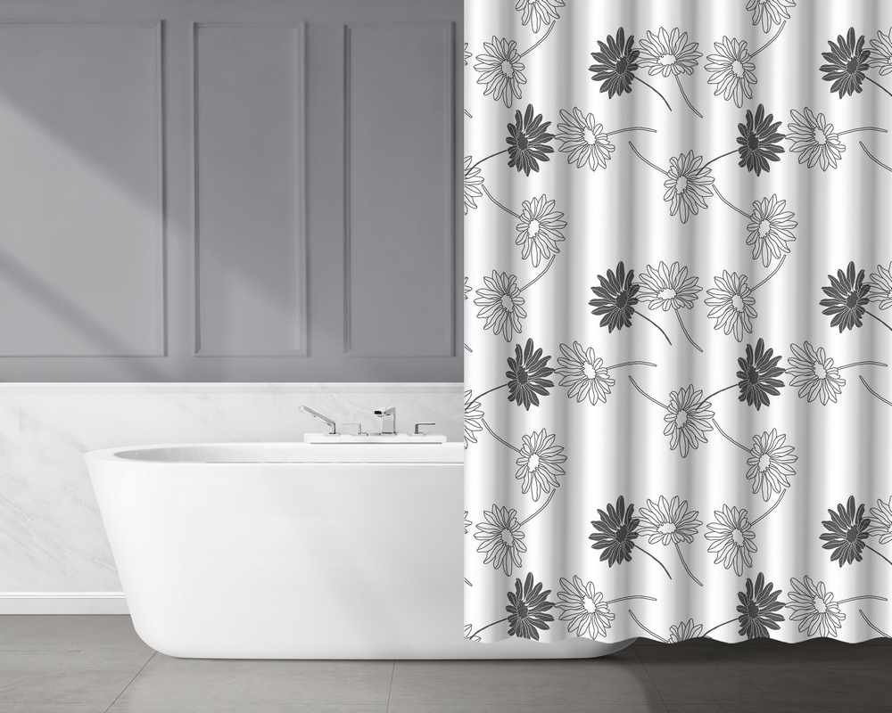 Závěs koupelnový 180x180 cm splní svůj účel dokonale - ochrání vaši koupelnu před stříkající vodou a zároveň přispěje k příjemné atmosféře díky jemnému dekoru kvítků. Vyroben je z materiálu 100% PEVA, který je nejen voděodolný, ale také příjemnější na dotek než běžné PVC.