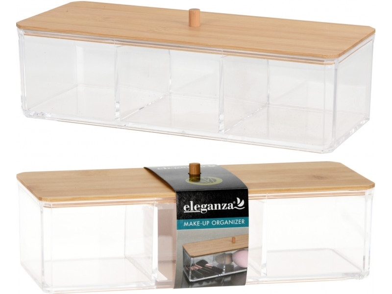 Kosmetická dělená dóza s víčkem uloží vatové tampóny i jiné kosmetické potřeby nebo líčidla. Využít ji můžete v koupelně ale i jinde v domácnosti na různé drobnosti. Dóza je dělena do tří sekcí. Materiál plast, bambus. Rozměry 23.5 x 9.5 x 6.5/7 cm. EAN 5999122851438 číst celé