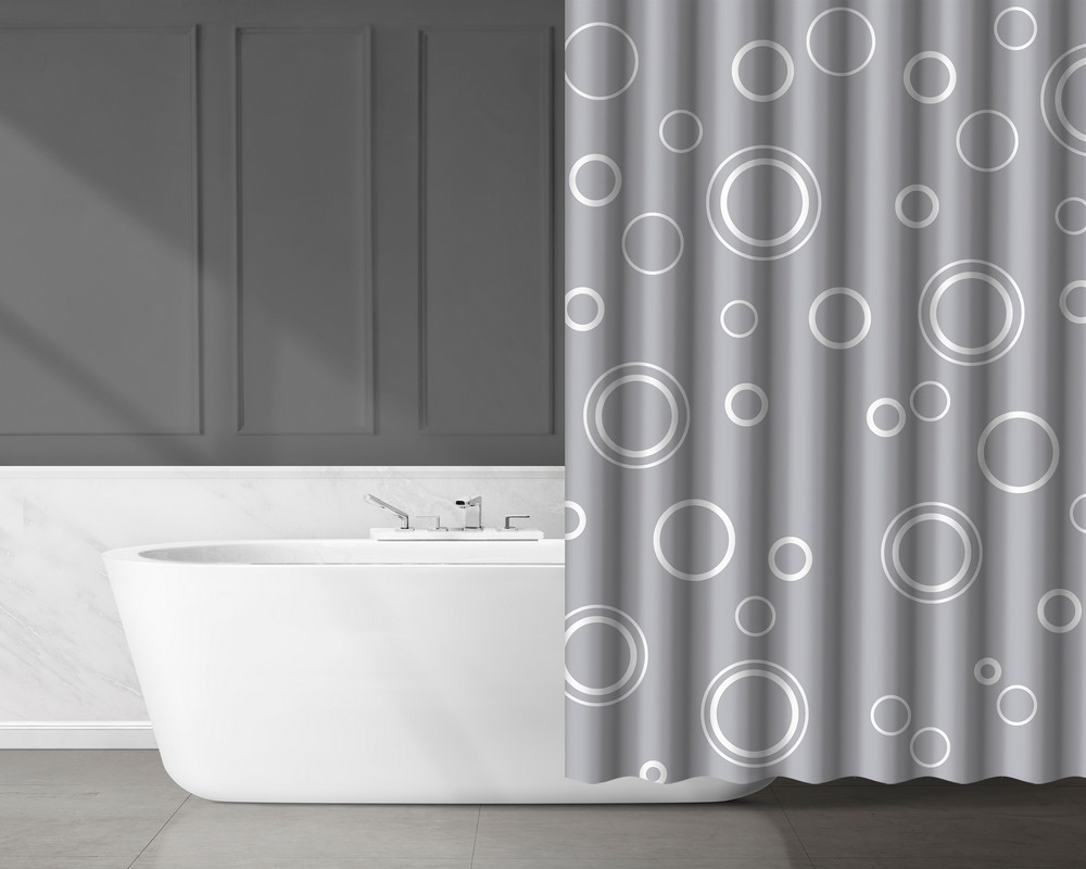 Textilní sprchový závěs v bílé barvě se vzorem bublin vyrobený z polyesteru. Sada obsahuje 12 bílých závěsných kroužků. Textilní sprchový závěs je vhodný pro jemné praní na 30 stupňů a žehlení na nízkou teplotu. Nečistit chemicky, nebělit, nesušit v sušičce. Rozměry 180 x 180 cm. EAN 5901812351142