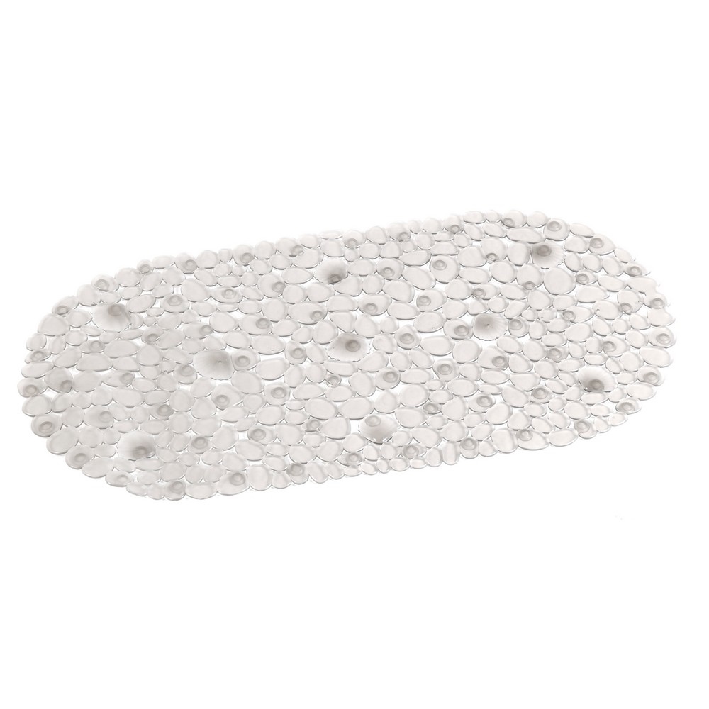 Kvalitní oválná průhledná koupelnová podložka s oblázkovým motivem. Ze spodní strany má protiskluzové přísavky pro zajištění bezpečnosti v koupelně. Čistit na 30 stupňů, nežehlit, chemicky nečistit, nebělit, nesušit v sušičce. Materiál PVC.Rozměry 69 x 0.2 x 35 cm. EAN 5901812350718 číst celé