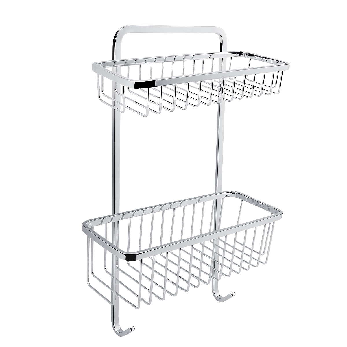 Drátěná police dvoupatrová do koupelny s háčky je skvělým doplňkem do koupelny. Opusťte konvenční tvary a vsaďte na osobitý styl! I zařízení koupelny o vás mnohé vypoví. Současné trendy se stále stáčejí k využívání chladného kovu a hran. Drátěná dvoupatrová police OPEN nabízí sladění moderních prvků i nadčasovosti. Vzdálenost mezi šrouby cca 28,50 cm.