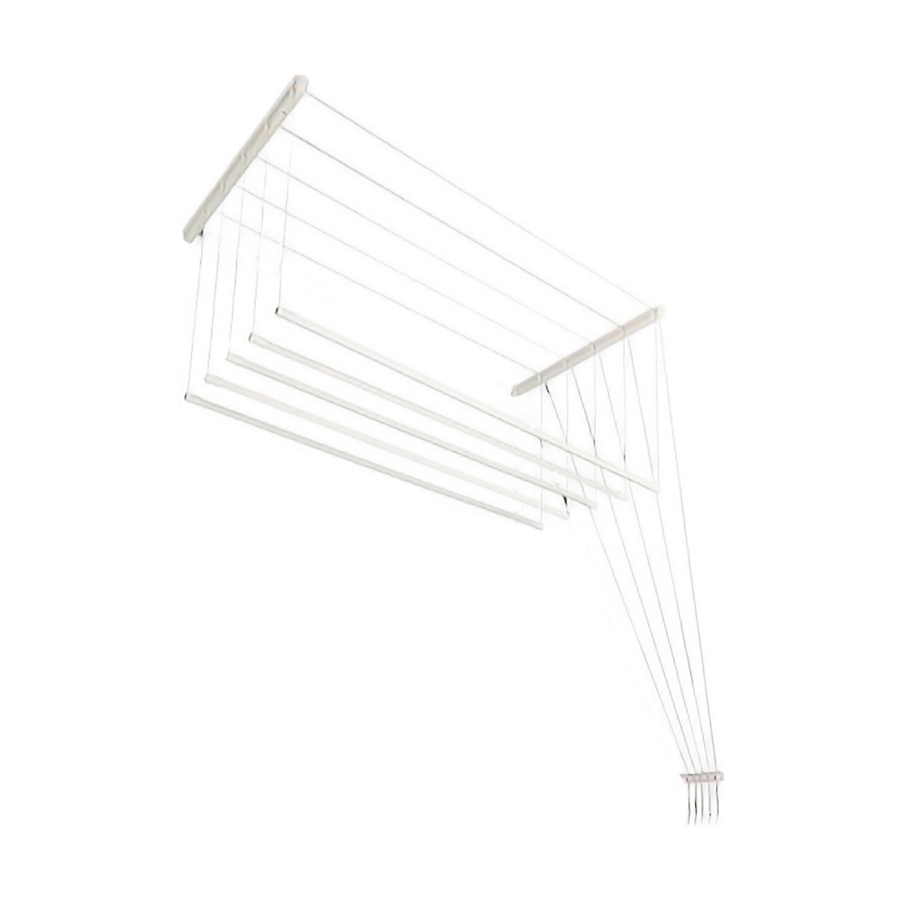 Suszarka sufitowa to idealne rozwiązanie dla niewielkich łazienek. Montuje się ją przy suficie, a specjalny mechanizm umożliwia opuszczenie sznurków na wygodną wysokość. Po zawieszeniu prania można podciągnąć linki wyżej tak aby pranie nie przeszkadzało w innych czynnościach. Dzięki niej nie trzeba już wspinać się na stołki i drabiny, aby powiesić pranie wysoko na sznurach.Polecana szczególnie dla osób starszych. Suszarkę możemy zamontować również na balkonie, a podciągając ją pod sam sufit, zyskujemy wolne miejsce po suszarką. Dzięki zastosowaniu grubych metalowych prętów o długości 110 cm, pranie po wysuszenie nie nosi śladów zagnieceń, przez co prasowanie staje się łatwiejsze.
