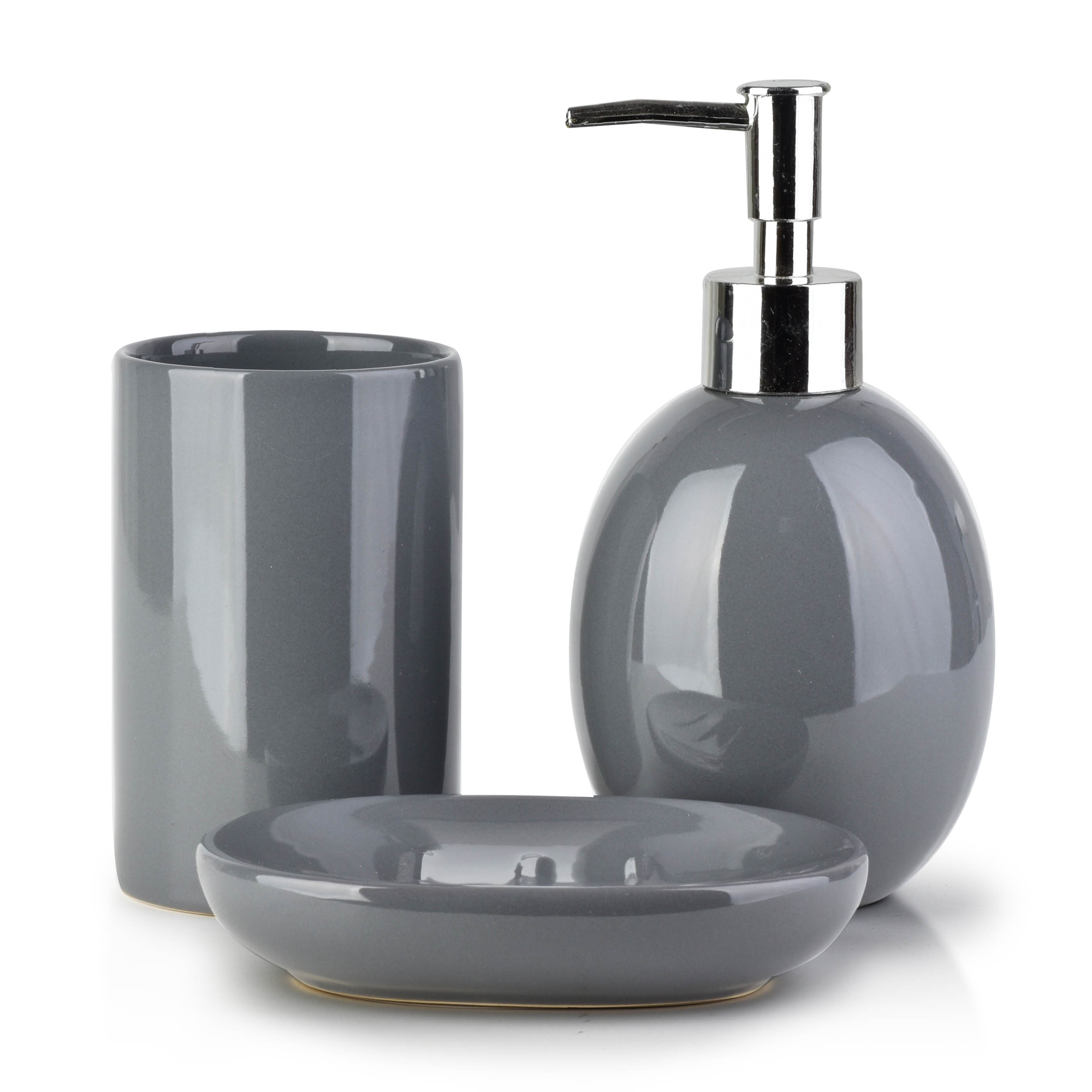 Komplet akcesoriów łazienkowych marki BATHLAB by MONDEX wykonany z ceramiki. Trzyczęściowy zestaw składający się z dozownika na mydło w płynie lub balsam, mydelniczki oraz kubka na przybory. dozownik 8x8xh17cm kubek 7x7xh11cm podstawka:13x9xh3cm