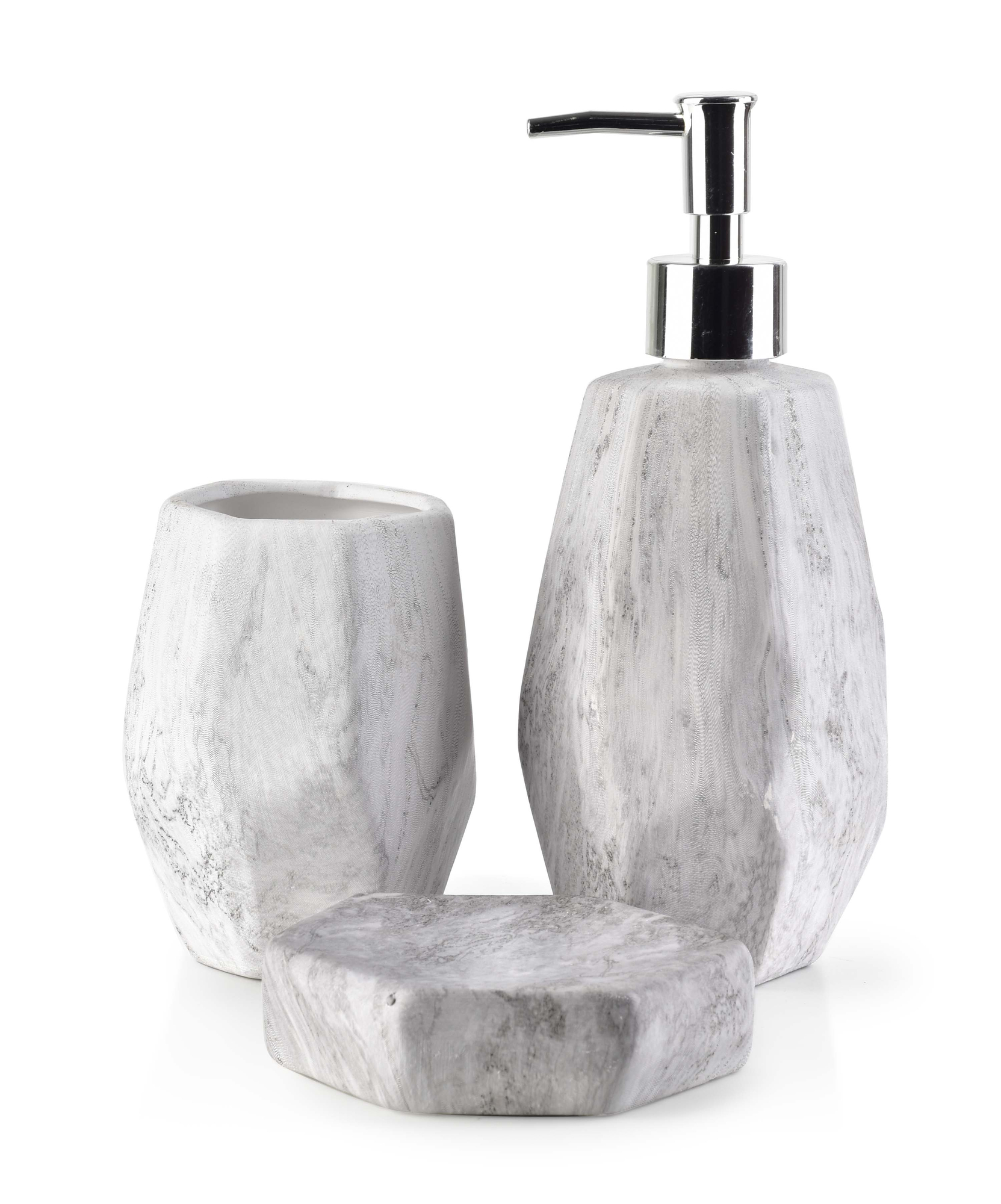 V sestavě najdete dozovník na mýdlo v tekuté formě nebo balzám, který pojme až 480 ml, mýdlenku a kelímek na hygienické potřeby. Díky své matné povrchové úpravě se set dokonale hodí do moderních i klasických koupelen, kde oceníte nejen design, ale i praktické využití.