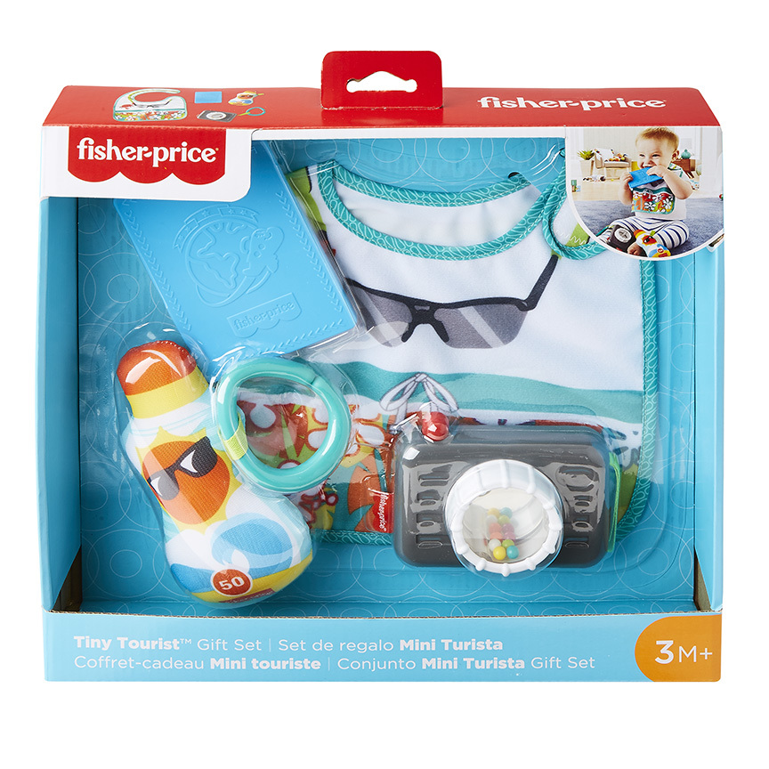 Děťátka žijí pro dobrodružství! S Fisher-Price® Dárkovým setem pro malé turisty se mohou malí milovníci cestování vydat na různá místa a být vybaveni 4 doplňky na dovolenou. Set 4 tematických hraček pro kojence obsahuje falešný foťák, který chrastí a cvaká, šustivou lahvičku opalovacího krému, kousátko, pas a bryndáček, který doplní jejich turistický vzhled. Všechny ty vzrušující zvuky a povrchy zapojí rozvíjející se smysly vašeho děťátka, zatímco manipulace s hračkami pomáhá posílit jejich jemnou motoriku.