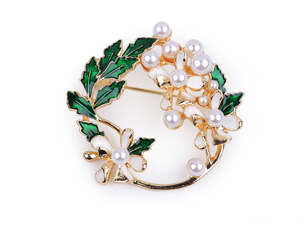 Elegantní brož s rostlinným motivem se smaltem bude perfektním doplňkem vašeho oděvu. Díky perlám skvěle dozdobí halenky, šaty, saka, svetry, kabáty, kabelky či čepice. Hodí se i na ozdobné sepnutí šátku.Brož má vzadu brožový špendlík. Je na plastové kartě, která se dá zavěsit na prodejní stojany.