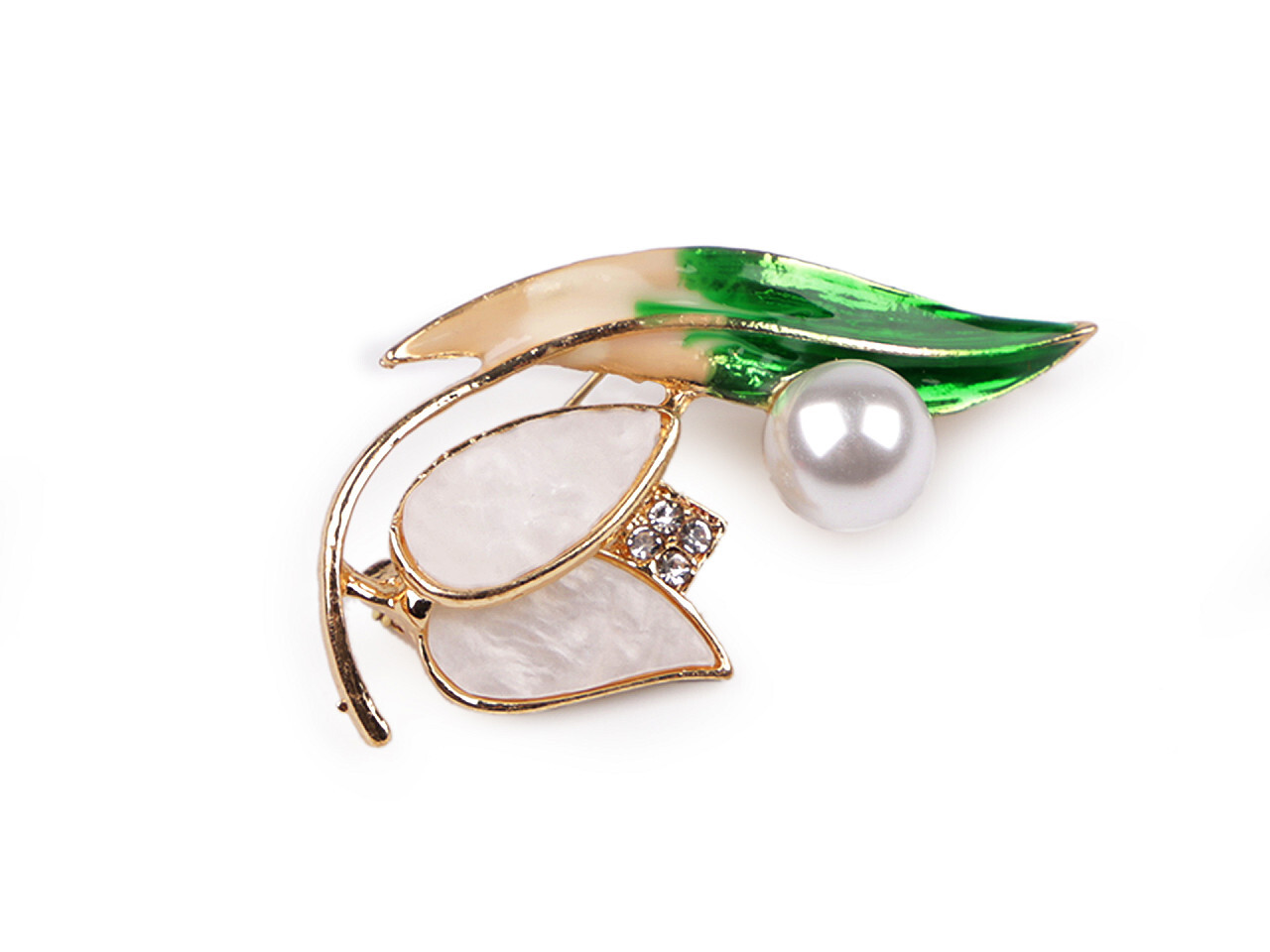 Elegantní brož s motivem rostlin bude perfektním doplňkem vašeho oděvu. Díky perlám a barevnému smaltu skvěle dozdobí halenky, šaty, saka, svetry, kabáty, kabelky či čepice. Hodí se i na ozdobné sepnutí šátku.Brož má vzadu brožový špendlík. Je na plastové kartě, která se dá zavěsit na prodejní...