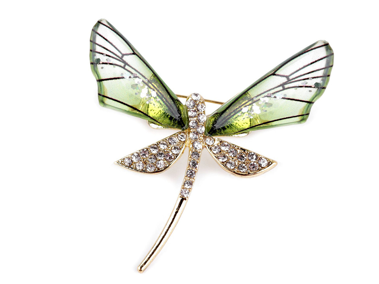 Brož s broušenými kamínky vážka, motýl - 1 ks - 3 zelená sv. vážka
