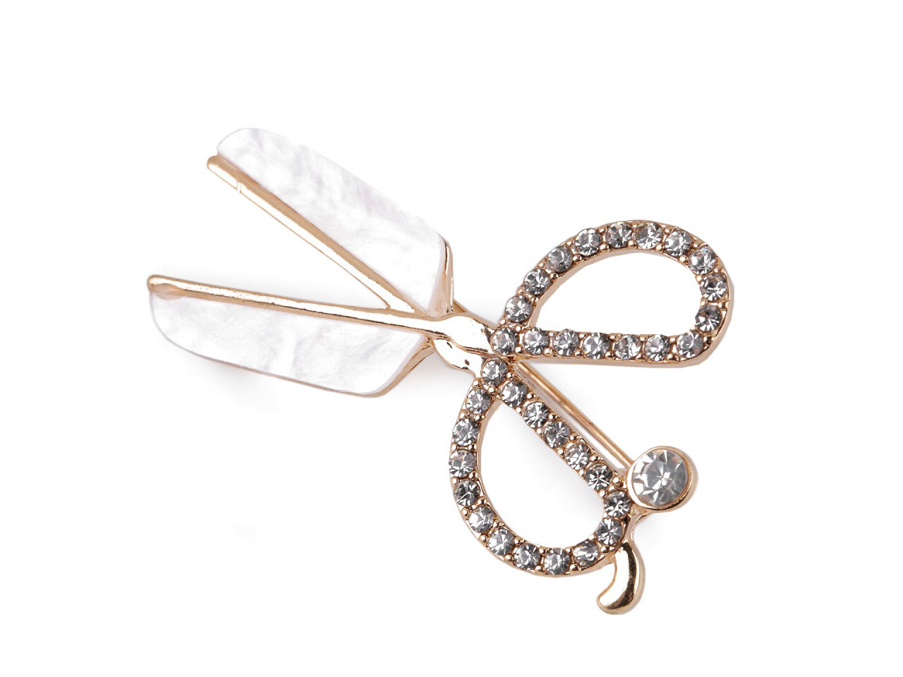 Brož elegantních nůžek bude skvělým dárkem nejen pro švadlenku nebo kadeřnici. Je osázená třpytivými, broušenými kamínky, nožky jsou ozdobené imitací perleti. Ze zadní strany má zavírací špendlík. Efektně působí nejen na oděvech, ale je vhodná i k ozdobení klobouků, tašky či sepnutí šátku.