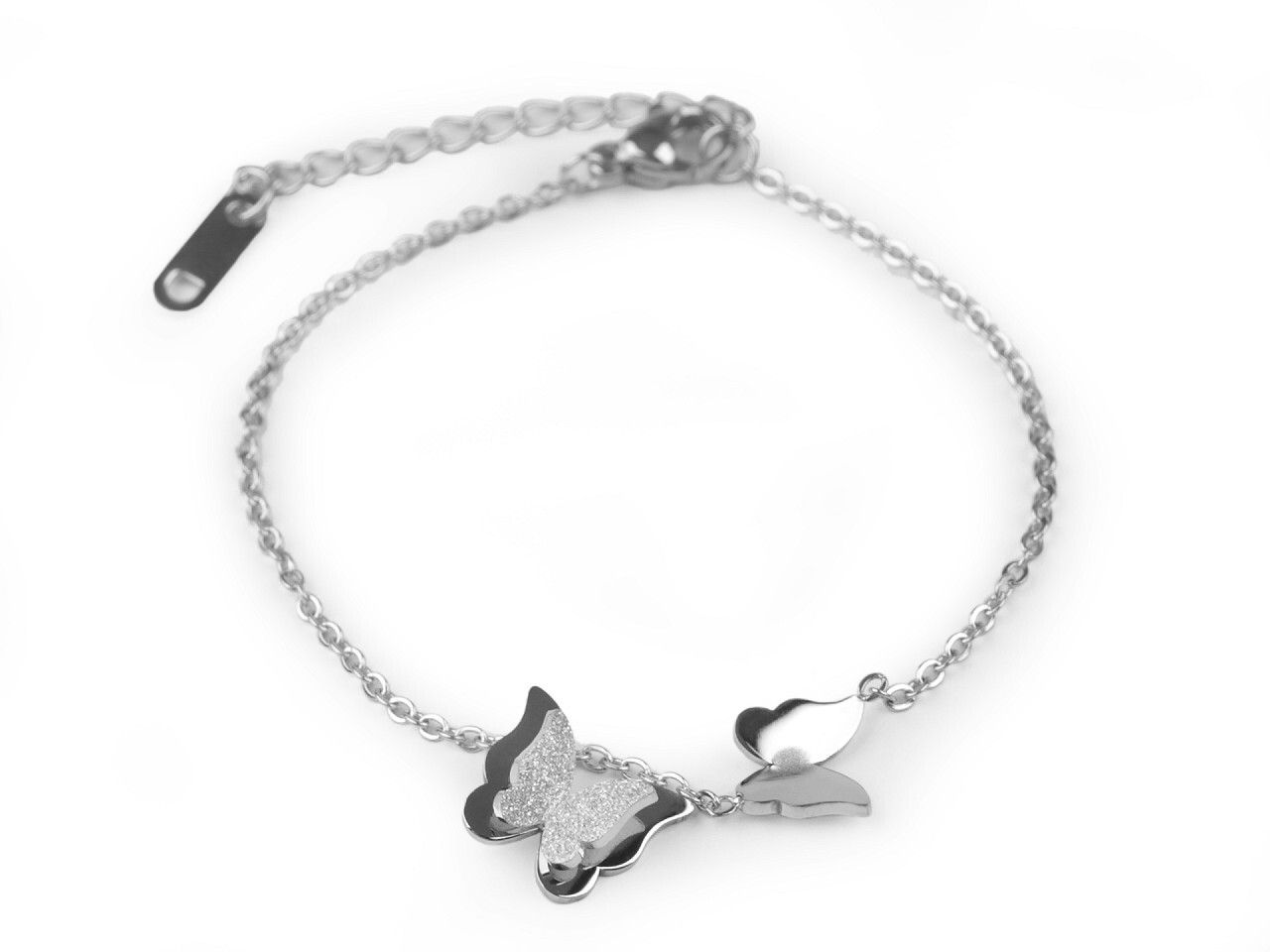Jemný řetízkový náramek z nerezové oceli je ozdobený motýly. Větší motýl je zavěšený jako přívěsek, na náramku se pohybuje, křídla má ozdobená pískováním, zajímavě se třpytí. Menší motýl má zrcadlový lesk, je pevný, na náramku se nepohybuje. Náramek má kvalitní zpracování, romanticky a decentně dozdobí vaše zápěstí.