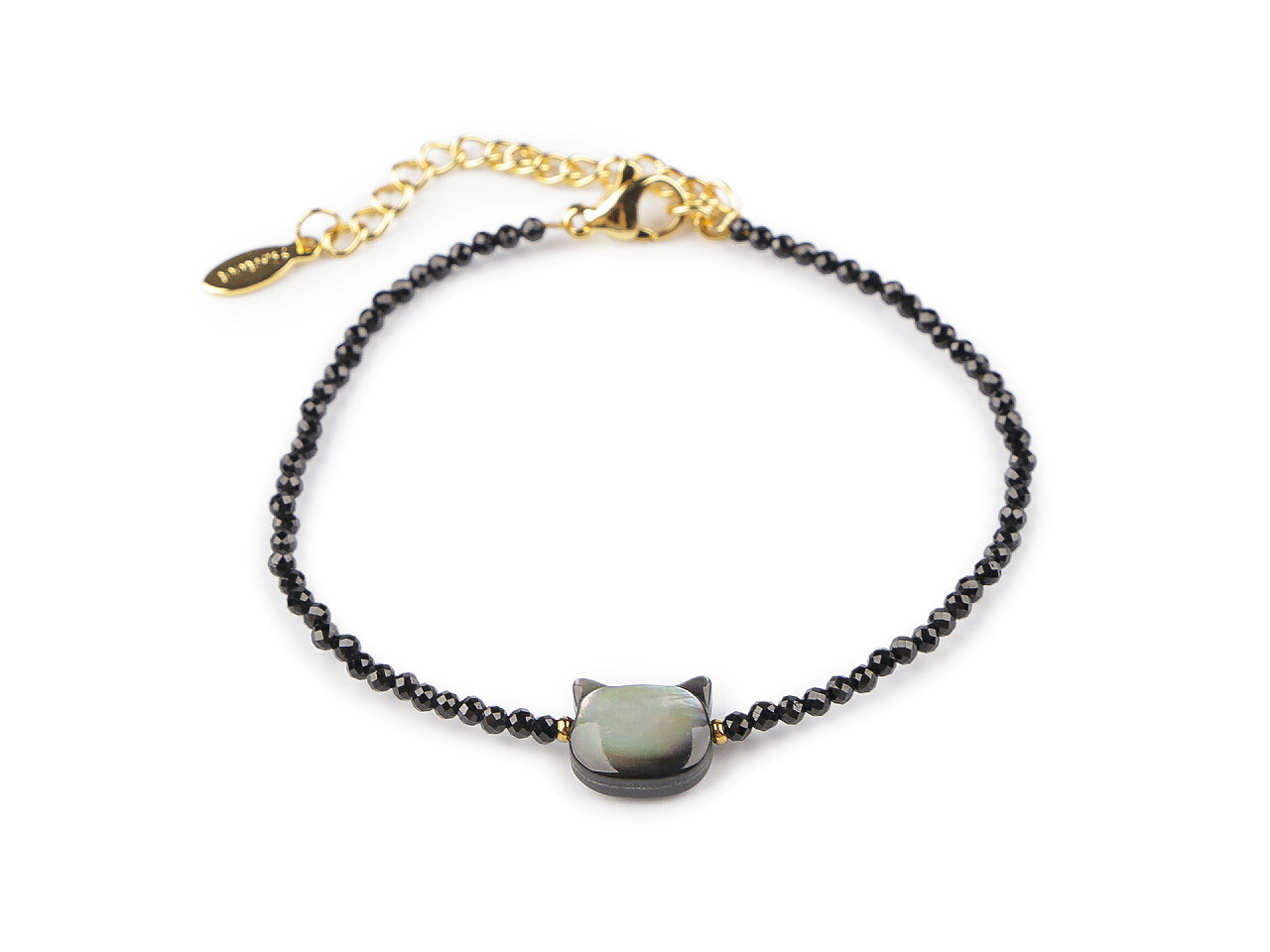 Náramek z broušených korálků je ozdobený perleťovým korálkem kočky. Je elegantním doplňkem, který zaujme svým precizním zpracováním a jedinečným designem, decentně dozdobí vaše zápěstí. Je ideálním dárkem pro milovníky zvířat a všechny, kteří hledají něco originálního pro své každodenní outfity.