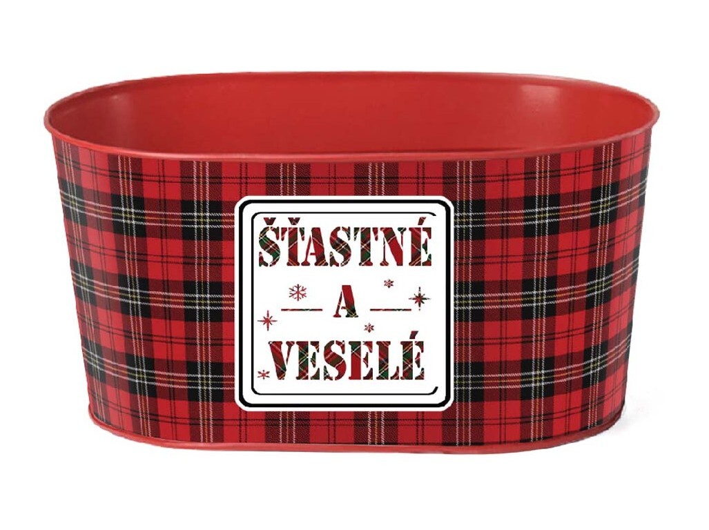 Květináč plechový 225x110mm oválný "Šťastné a veselé" kostička, červená, černá, zelená