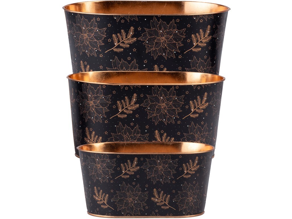 Květináč plechový 3 ks 255x155x130/ 225x135x110/195x110x90mm oválný květ vánoční hvězdy s větvičkou, černá, zlatá