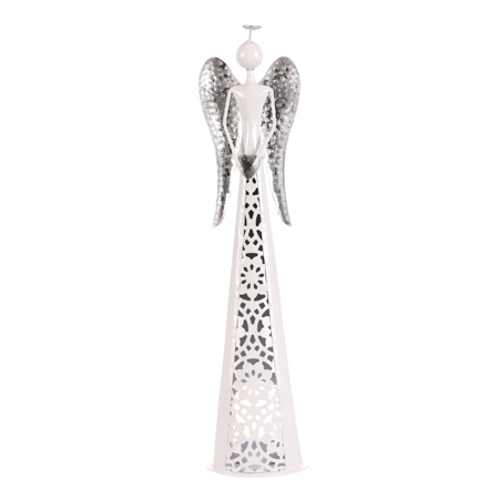 Anděl kovový se srdcem, na čajovou/LED svíčku, bílá barva.
