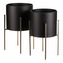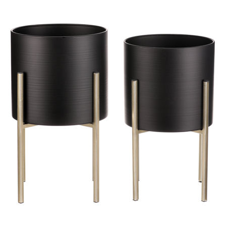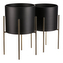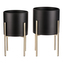 Set 2 ks kovových stojanů na květiny. interiérové provedení. Konstrukce a obal na květináč je kovový. Obal je v černém matu a nohy ve zlaté matné barvě.