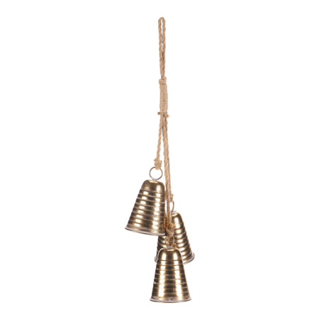 Trojice kovových zvonů ve zlatých barvách na provázku přináší do vánoční výzdoby nádech tradice i originality. Díky větší velikosti se úplně nehodí na klasický stromeček, ale vyniknou nejlépe jako samostatná dekorace, třeba na dveřích, stěně nebo větvi. Uvedená cena je za tři zvonky, které jsou provázky svázané do jedné ucelené ozdoby.