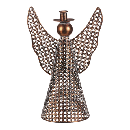 Kovový anděl vysoký přibližně 35 cm je elegantní vánoční dekorace v měděném odstínu. Na jeho kulaté hlavičce se nachází kalíšek přizpůsobený pro umístění kónické svíčky. Nabízí tak neodolatelnou kombinaci vkusné dekorace s možností vytvořit nádherný světelný efekt. Díky jemným kruhovým otvorům působí vzdušně a vkusně ozdobí váš interiér během svátečního období.