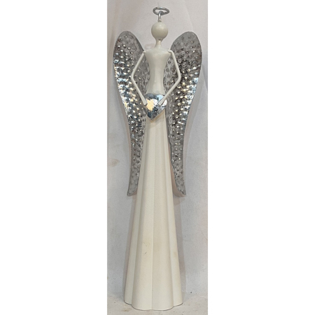 Anděl kovový se srdcem v bílé barvě je stylovým dekoračním prvkem, který vnese do vašeho prostoru nádech elegance a klidu. Jeho minimalistický design a decentní barevné provedení snadno zapadne do různých interiérů i exteriérů.