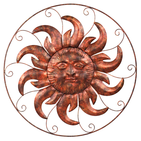 Tato unikátní kovová nástěnná dekorace představuje slunce v měděné barvě. Je elegantně vsazeno do kruhu a má tři různé druhy paprsků, které se vzájemně střídají ve stejném pořadí. V jeho středu je vyobrazen obličej, což mu dodává na živosti. Nejtenčími a zároveň nejdelšími paprsky je spojeno s vnějším kruhovým rámem. Tato nádherná závěsná dekorace dodá krásu zejména venkovním prostorům. Pokud však najdete vhodné místo, může zdobit i interiér. Celá konstrukce představuje dokonalý harmonický celek, který bude na zdi skutečně vynikat. Vaši návštěvníci, případně kolemjdoucí, budou v úžasu při pohledu na tento dekorační skvost.