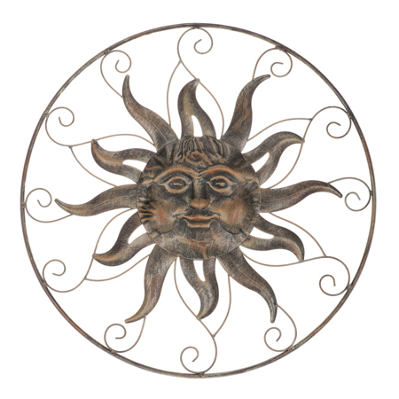 Tato unikátní kovová nástěnná dekorace představuje slunce v barvě přípomínající mosaz s příměsy šedých odstínů. Je elegantně vsazeno do kruhu a má tři různé druhy paprsků, které se vzájemně střídají ve stejném pořadí. V jeho středu je vyobrazen obličej, což mu dodává na živosti. Nejtenčími a zároveň nejdelšími paprsky je spojeno s vnějším kruhovým rámem. Tato nádherná závěsná dekorace dodá krásu zejména venkovním prostorům. Pokud však najdete vhodné místo, může zdobit i interiér. Celá konstrukce představuje dokonalý harmonický celek, který bude na zdi skutečně vynikat. Vaši návštěvníci, případně kolemjdoucí, budou v úžasu při pohledu na tento dekorační skvost.