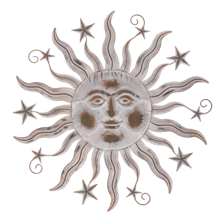 Tato nástěnná kovová dekorace v bílé antické barvě představuje slunce s paprsky a hvězdami na jejich koncích. Paprsky a hvězdičky jsou nádherně pravidelné a střídají se vždy ve stejném pořadí, vytvářejíce harmonickou a symetrickou ozdobu. Tato dekorace bude skvělým přídavkem zejména na venkovní zdi, a díky svým dostatečně velkým rozměrům bude dominantním prvkem, který upoutá pozornost všech kolemjdoucích. Pro ty, kteří mají rádi astronomii a obdivují nebeské úkazy, bude tato dekorace obzvlášť působivá.