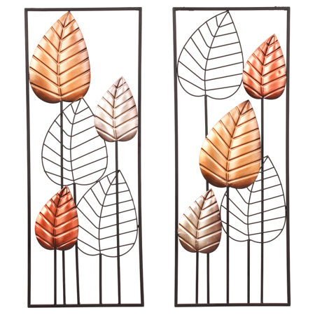 Nástěnná kovová dekorace - listy v rámečku, cena za sadu 2 ks.
