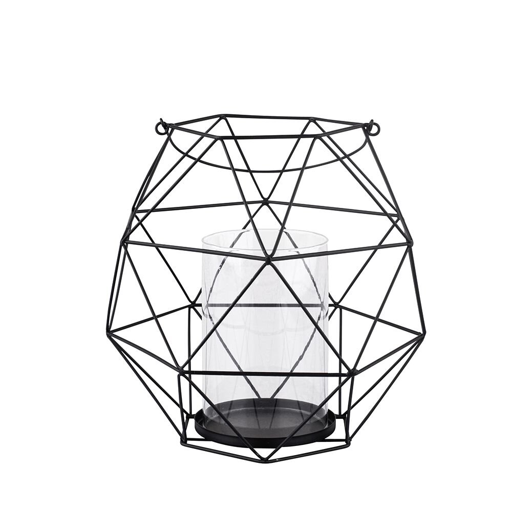SVÍČNÍK KOVANÝ GEOMETRICKÝ S DRŽÁKEM A SKLENĚNÝM VLOŽKOU 22X22X22CM ČERNÝ