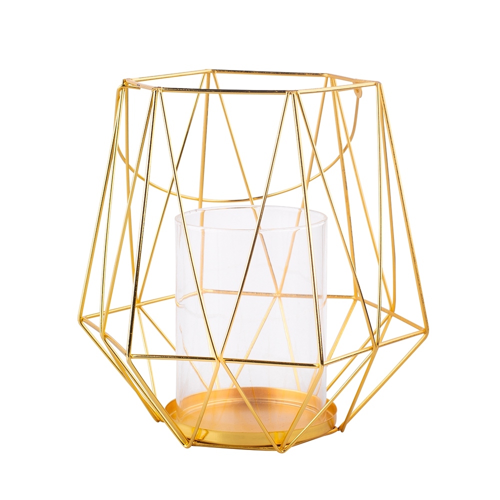 SVÍČNÍK KOVANÝ GEOMETRICKÝ S DRŽÁKEM A SKLENĚNÝM VLOŽKOU 20X18X20CM ZLATÝ
