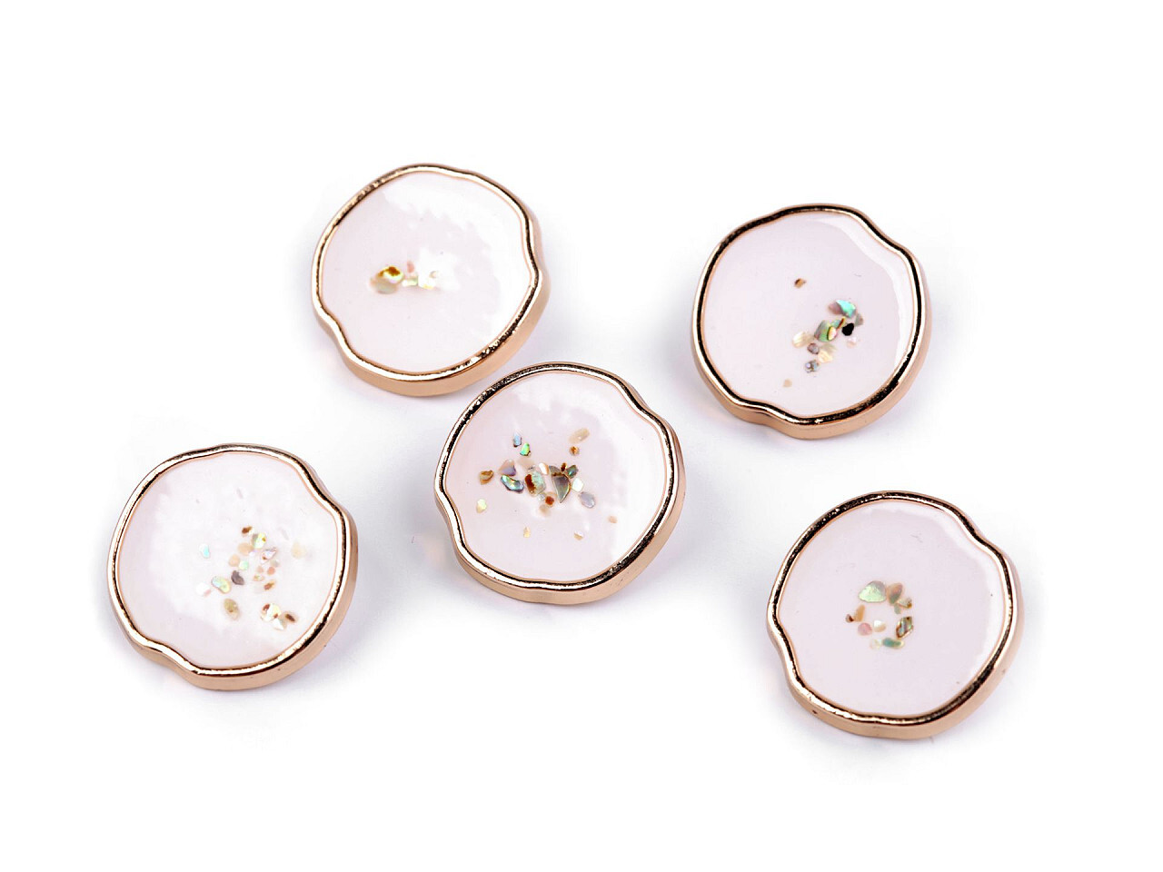 Luxusní kovové knoflíky zaujmou svým designem - mají nepravidelný kulatý tvar a naleznete v nich drobné kousky perleti zalité v pryskyřici. Vyniknou na košilích, svetrech, šatech, kabátech i taškách.Velikost knoflíků naleznete v této tabulce. číst celé