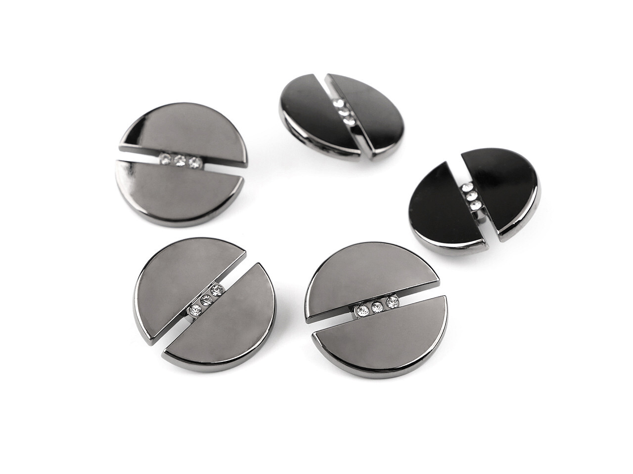 Lesklé kovové knoflíky vynikají elegantním designem a kvalitním zpracováním. Jejich střed zdobí broušené kamínky. Knoflíky můžete našít na kabáty, kardigany i saka. Mají spodní přišívání. Velikost knoflíků naleznete v této tabulce.